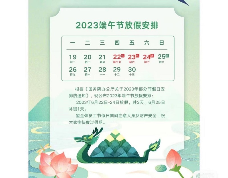 根據2023年端午節放假通知精神,放假具體安排通知如下:6月22日至6月24日放假共3天,不調休。